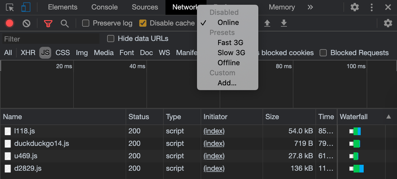 Vous pouvez utiliser les outils de développement de Chrome pour simuler une connexion de données lente. Pour ce faire, allez dans l'onglet "Réseau" et sélectionnez une connexion de données lente dans le menu déroulant "En ligne", par exemple "3G lente". En cochant la case "Désactiver le cache", vous pouvez voir comment votre site web se charge lorsqu'un utilisateur le visite pour la première fois - il n'y a pas de fichiers d'une visite précédente dans le cache.